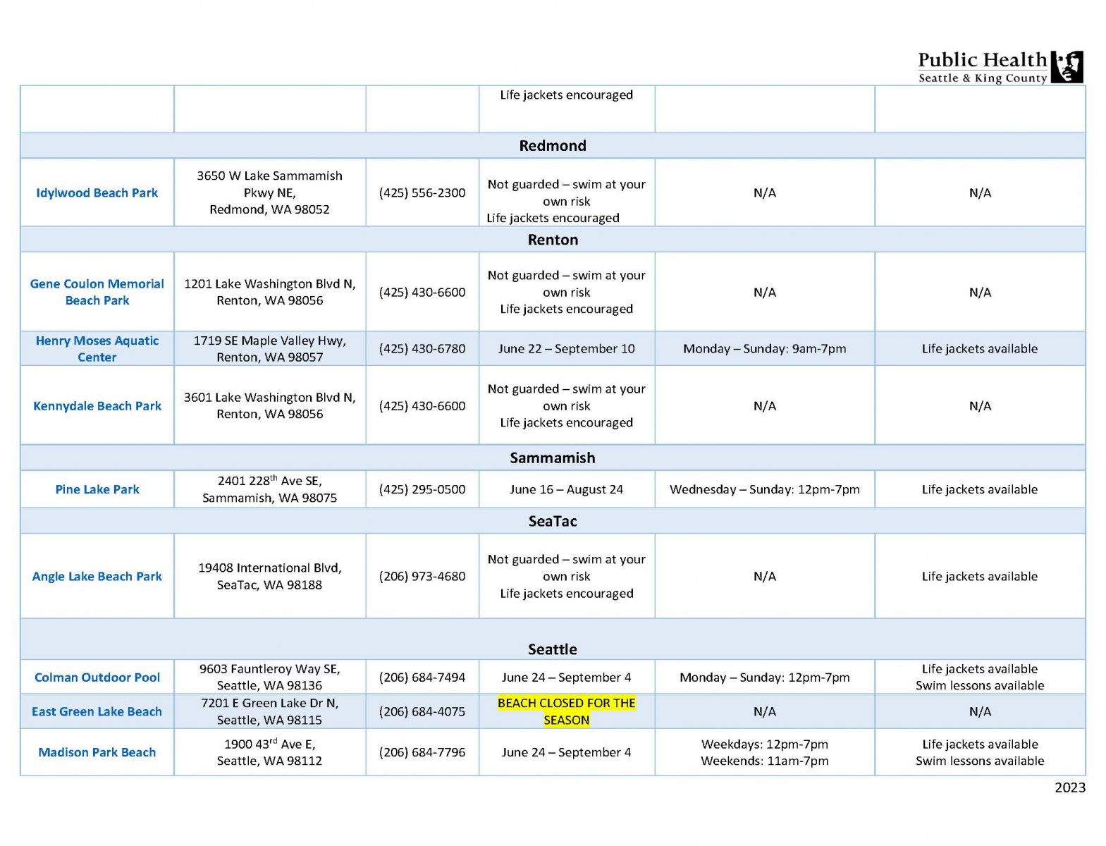 2023 King County Area Public Lifeguarded Beaches & Summer Outdoor Pools