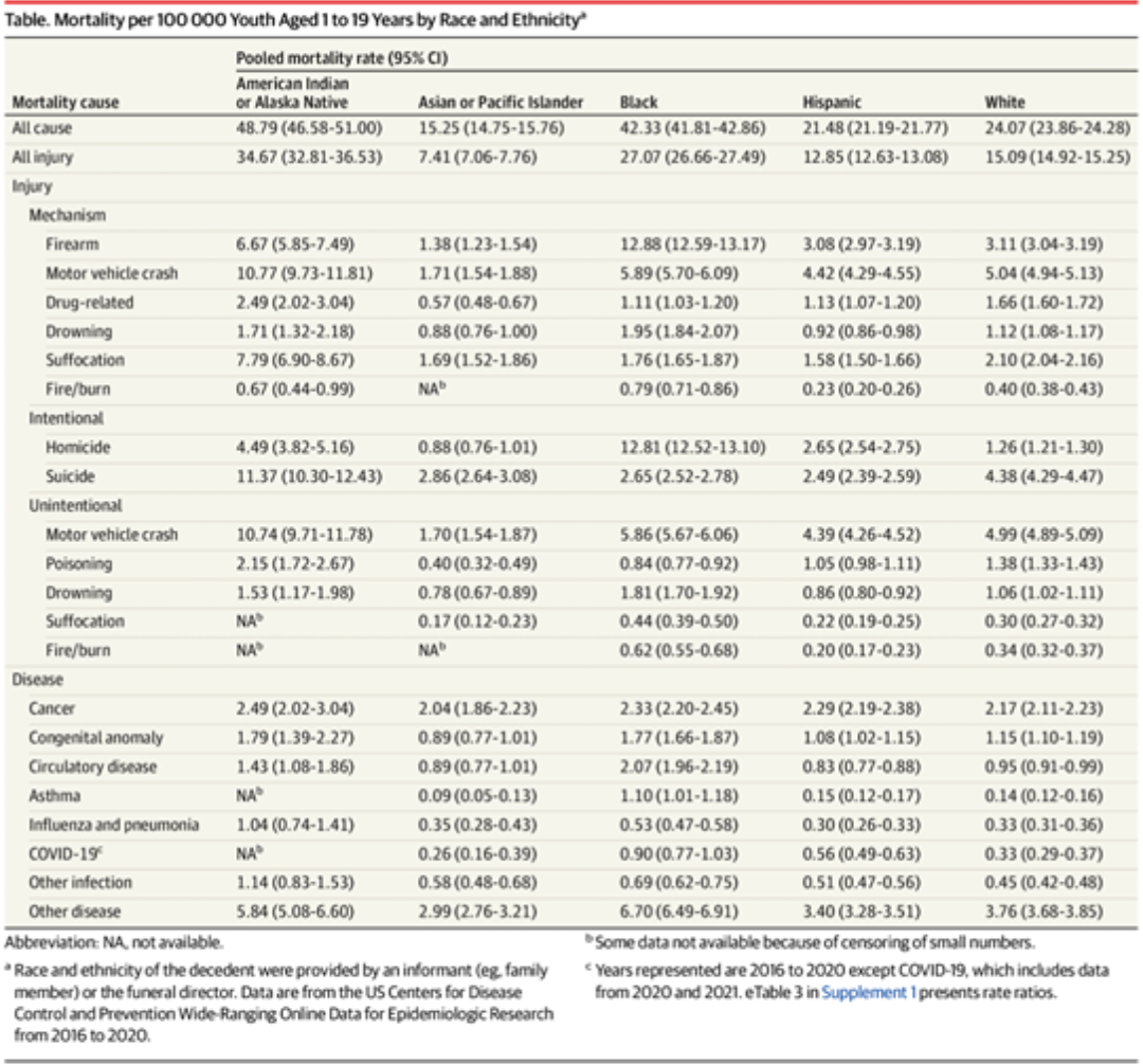 Table: Mortality per 100,000 Youth Aged 1-19 Years by Race and Ethnicity*